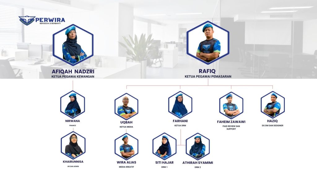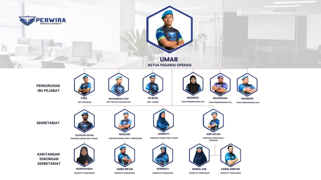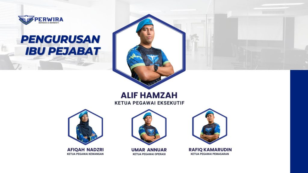 Pentadbiran Ibu Pejabat Perwira dianggotai oleh 5 orang kakitangan yang berfungsi sebagai penggerak utama pengurusan. Terbahagi kepada 4 jabatan utama iaitu Program, Hal Ehwal Perwira, Media dan Pentadbiran & Kewangan.